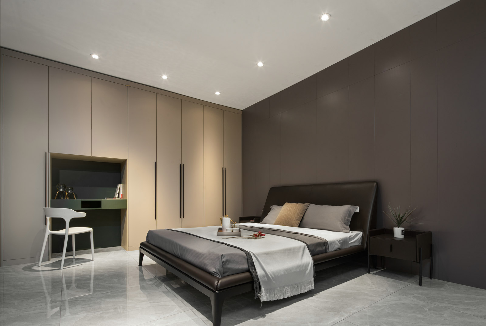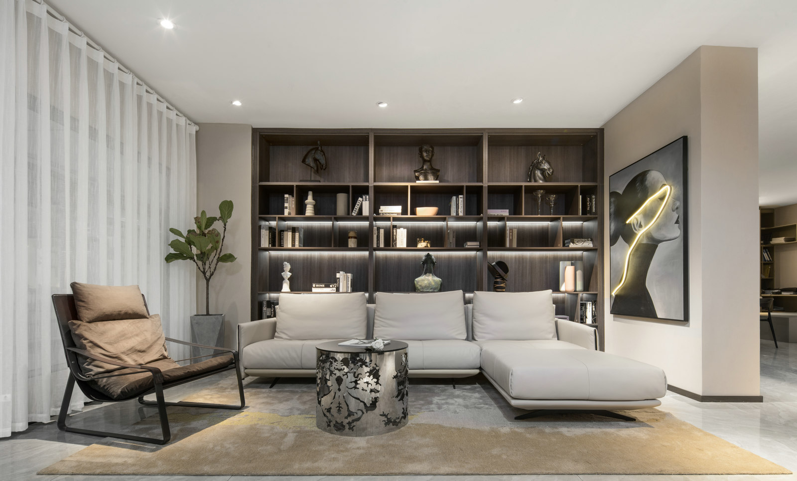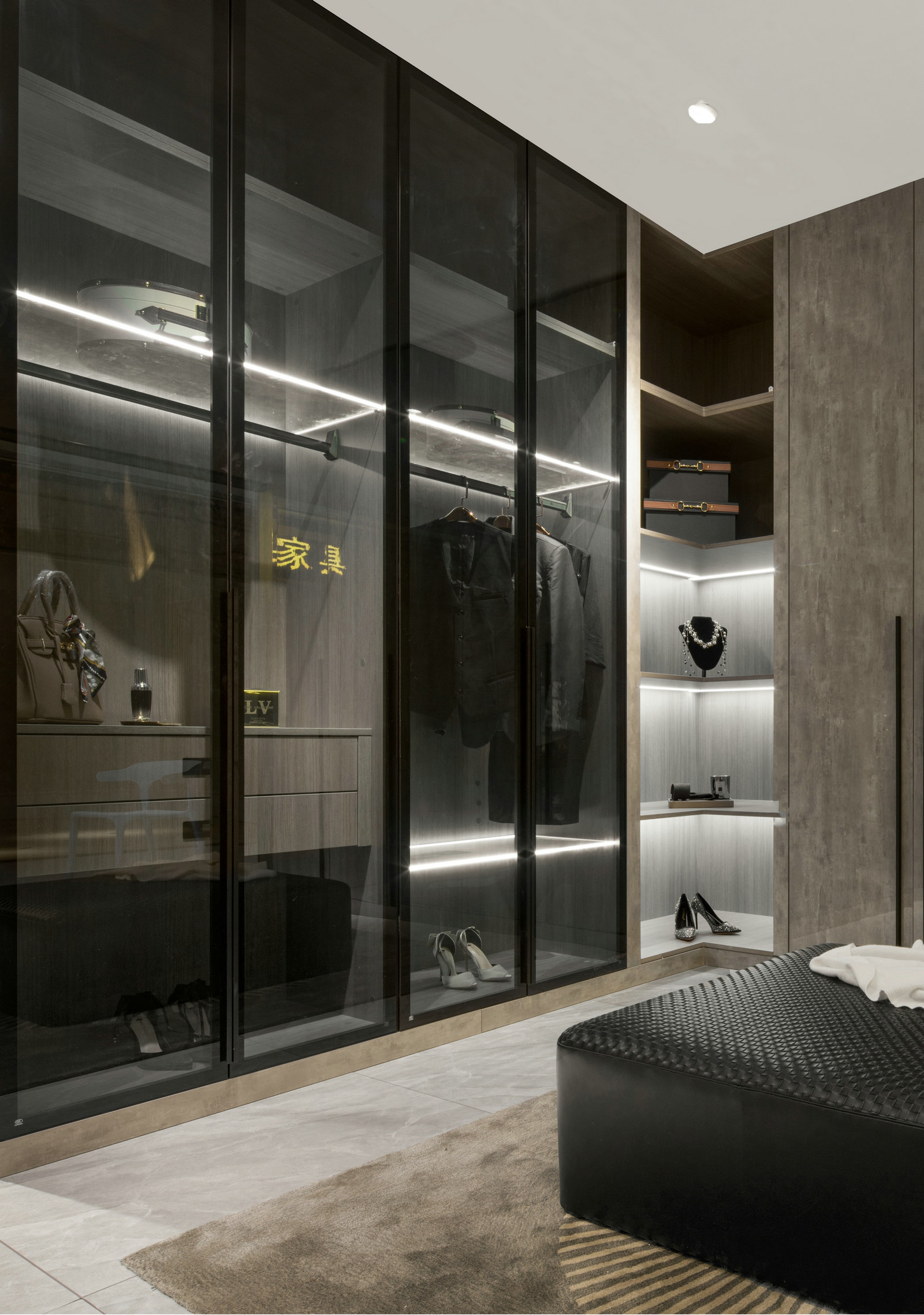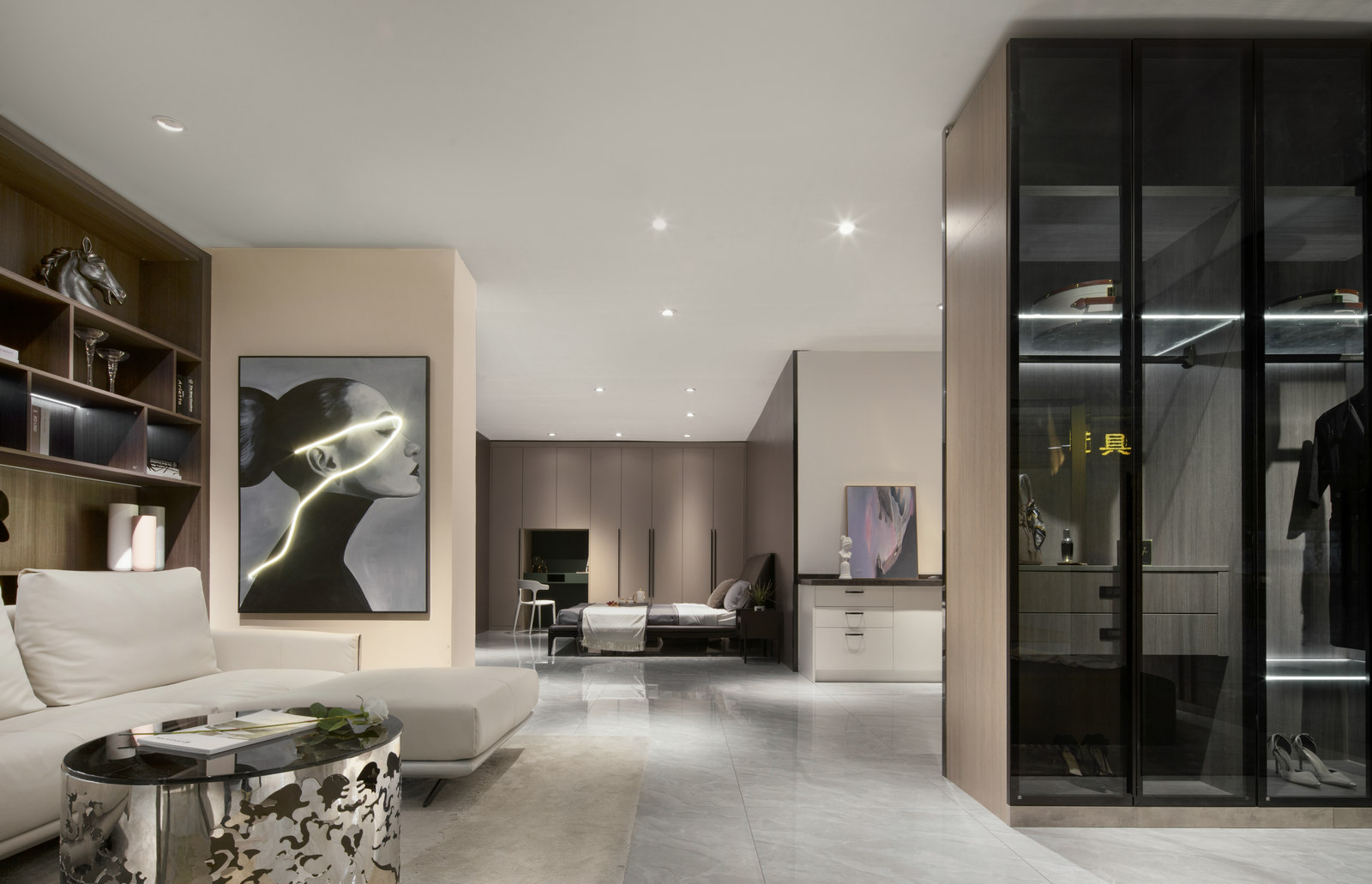本案為HK.A全屋定制展廳,設(shè)計師以現(xiàn)代輕奢風格呈現(xiàn),強調(diào)細節(jié),目光所及都是舒服時尚的氣息。輕奢代表一種優(yōu)雅、格調(diào)和對生活品質(zhì)的追求。用k木飾面、金屬線條等不同的材質(zhì)來賦予空間高級感。