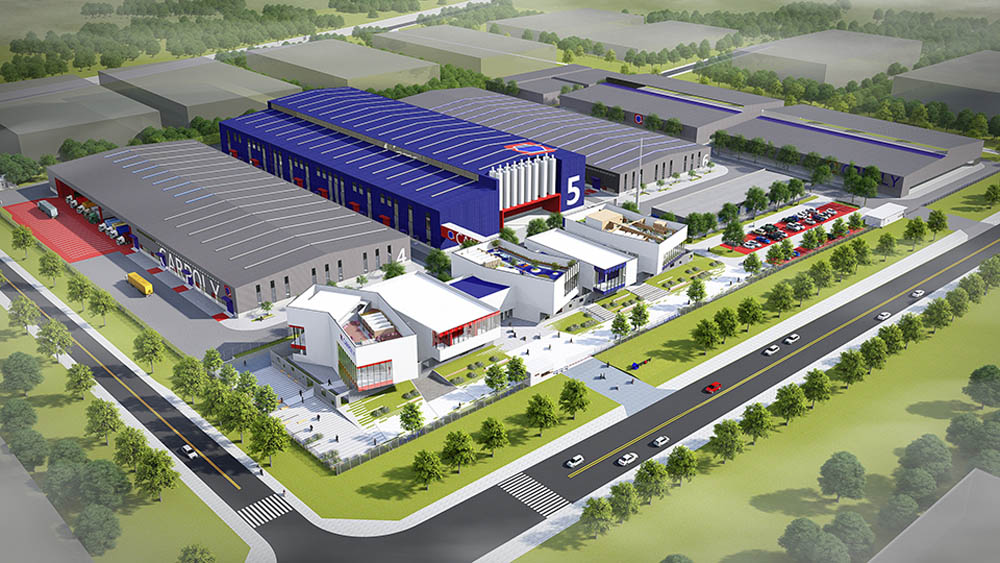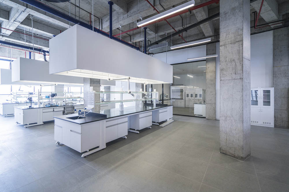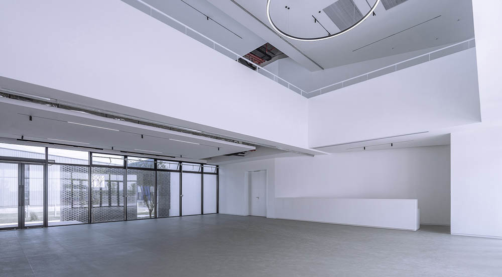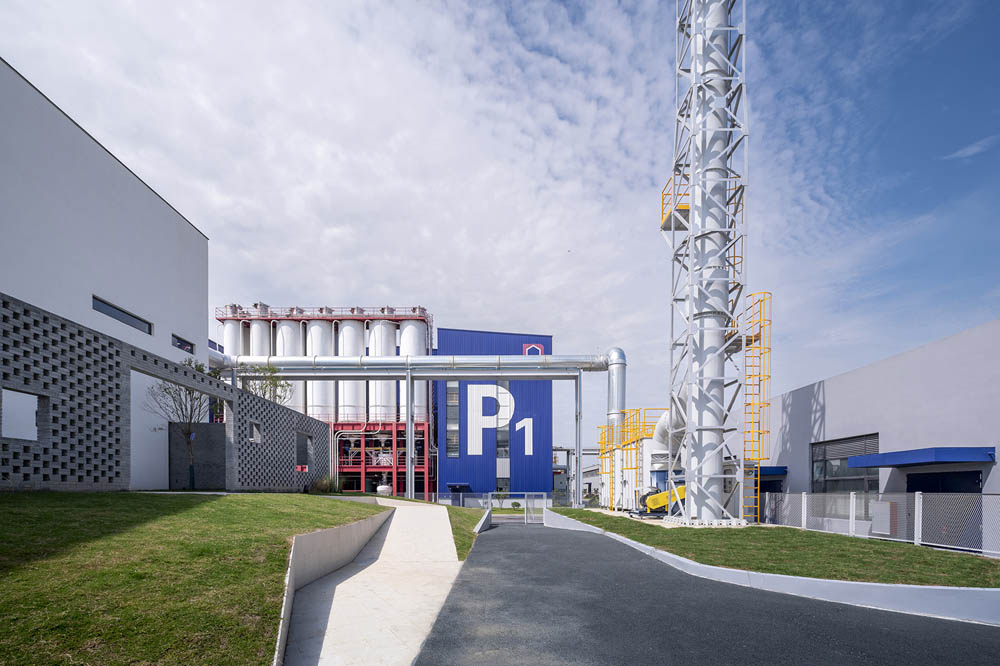 整個廠區(qū)的規(guī)劃的底層邏輯遵循著生產的秩序,建筑分為前端研發(fā)中心和后端廠房車間兩個部分——前端研發(fā)中心以實驗室、辦公為主,輔助以展廳、食堂、公共休息空間等;后端由兩個庫房和一個生產廠房三個體量組成。