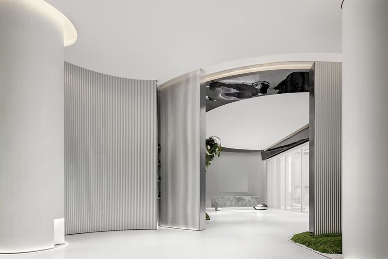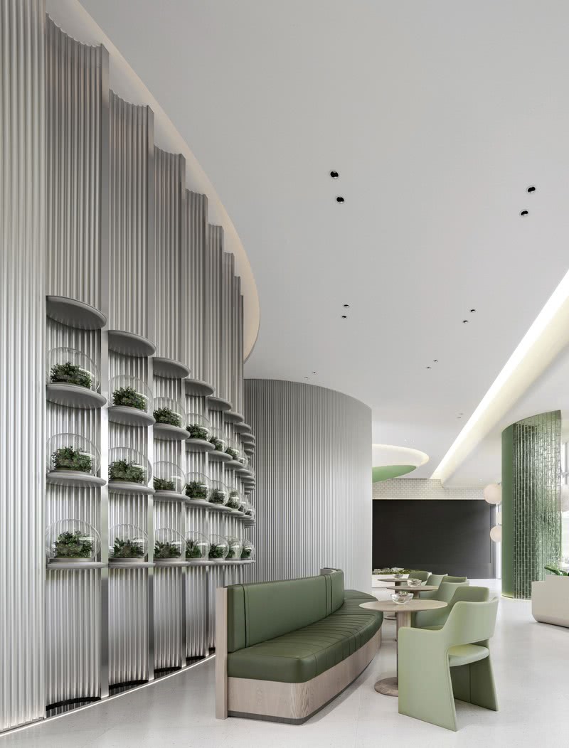 本次設(shè)計理念以樹洞象征著釋放、溝通及鏈接,是眾多童話故事或奇妙旅程的重要路引。以“樹洞”為空間的象征符號,在有限的空間內(nèi)巧設(shè)門洞作為間隔,如迷宮般神秘吸引,令人衍生無限想象,不禁探索其中。穿梭行走在“綠光森林”里,人慢慢變小,本來在石頭上的一個個造型各異的弧形門洞變成了宮殿廊柱,墻上的金屬管狀燈成了疊加的光源,為人們照亮去往下一個空間的路。