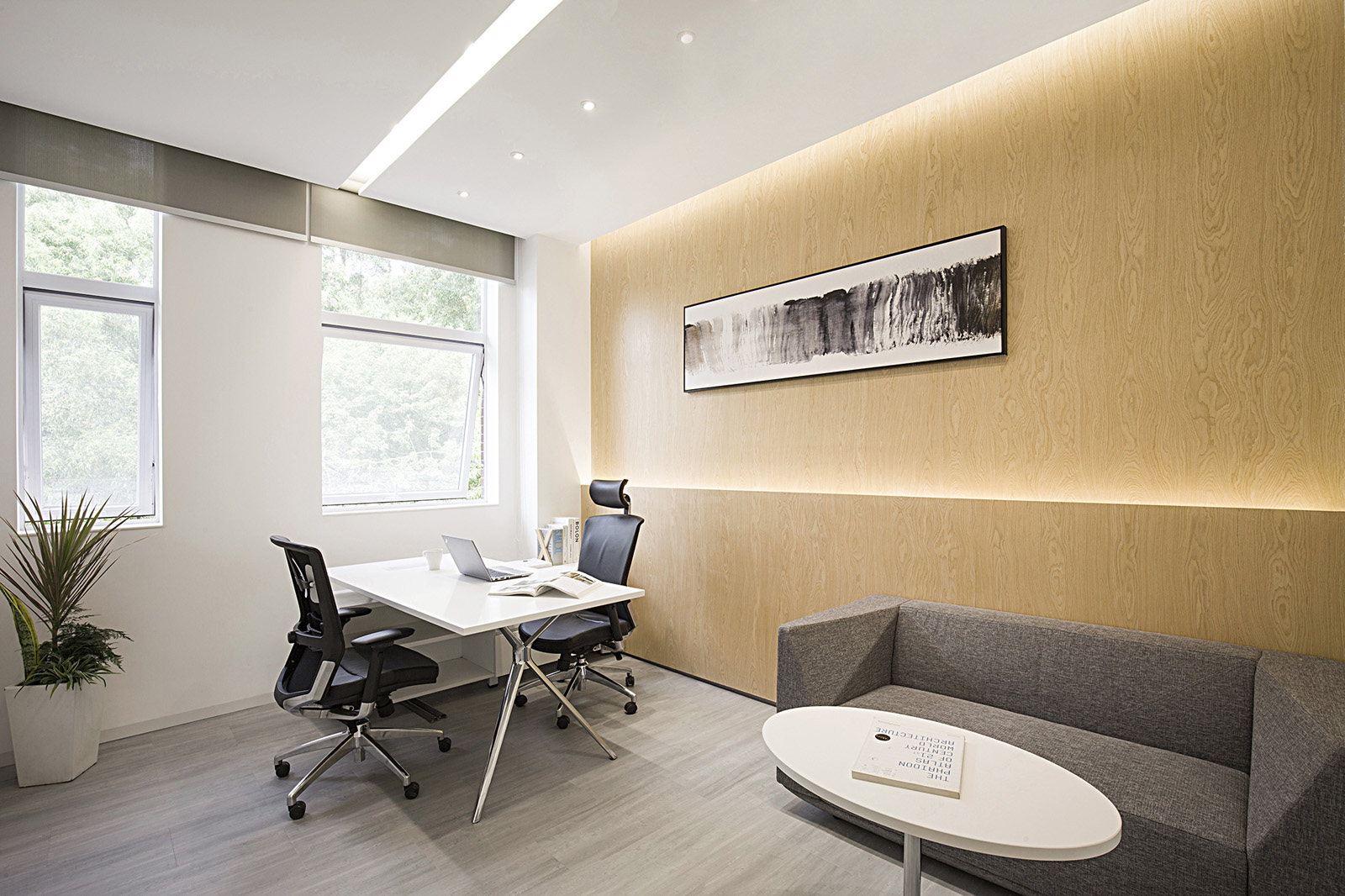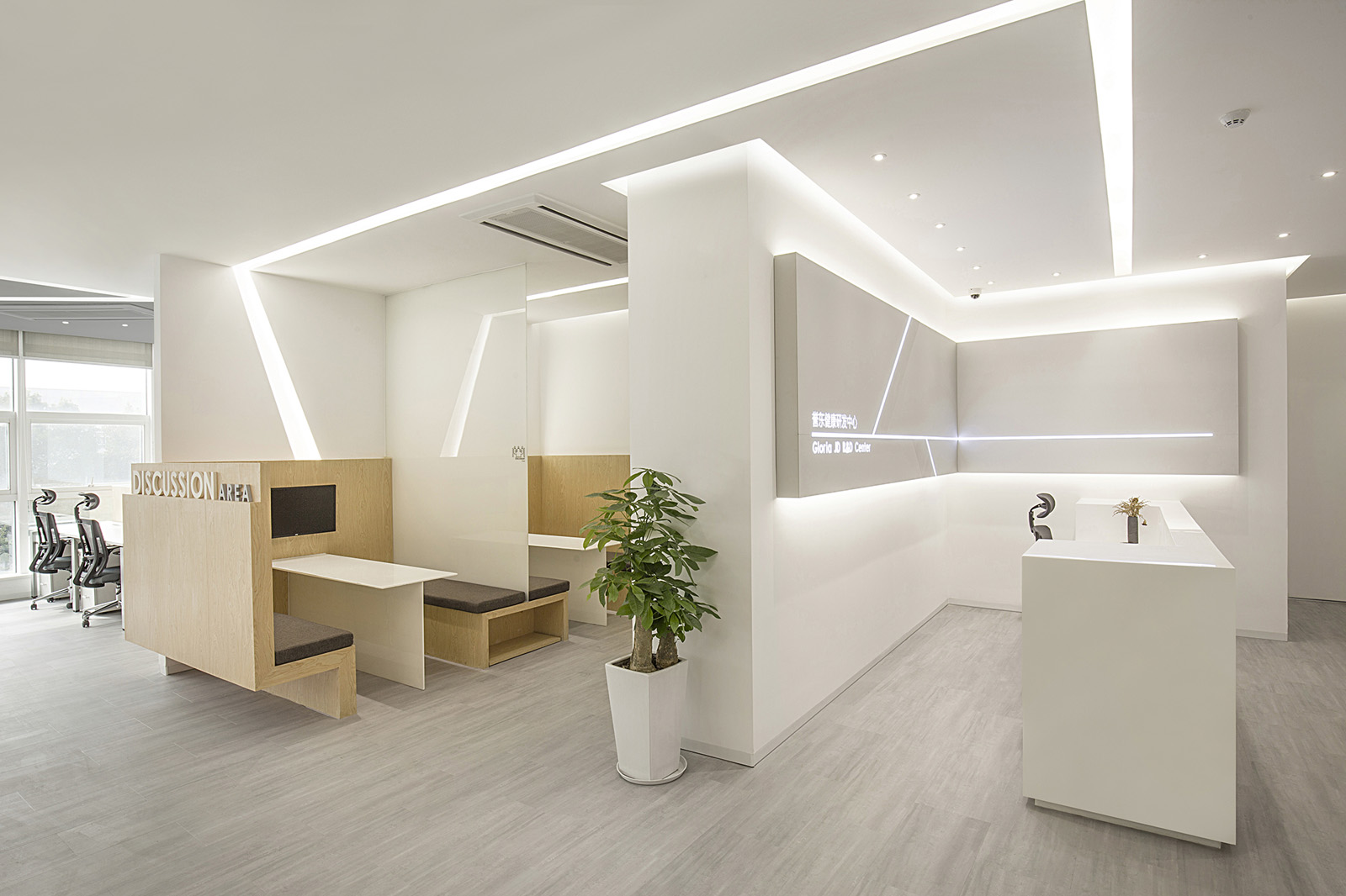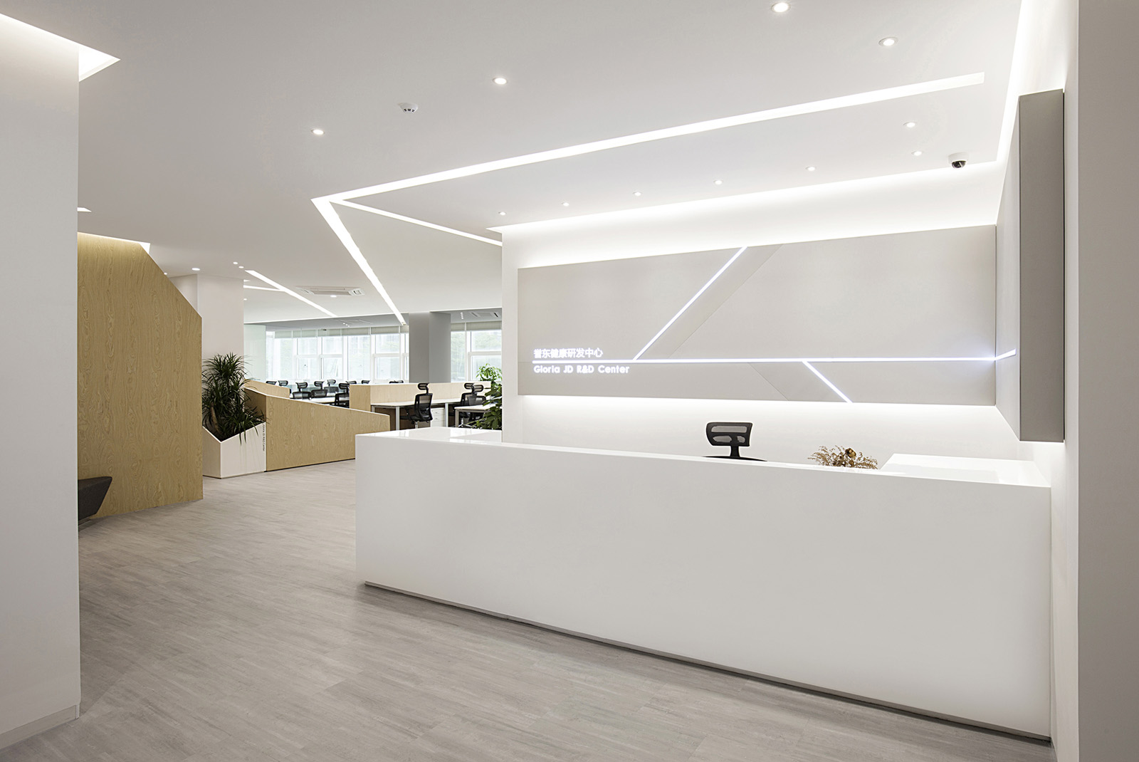 公司員工是醫(yī)藥健康方面的研發(fā)者,眾所周知科研是一門相對枯燥和嚴(yán)謹(jǐn)?shù)墓ぷ鳎瑥氖驴蒲泄ぷ鞅仨毐3指叨鹊膶W⒍?。從行業(yè)的特性考慮設(shè)計師決定結(jié)合興奮會促使多巴胺分泌的這一生理反應(yīng),把早晨的興奮條件延續(xù)到工作環(huán)境中,一個被光切割出來的空間成為了設(shè)計目標(biāo)。