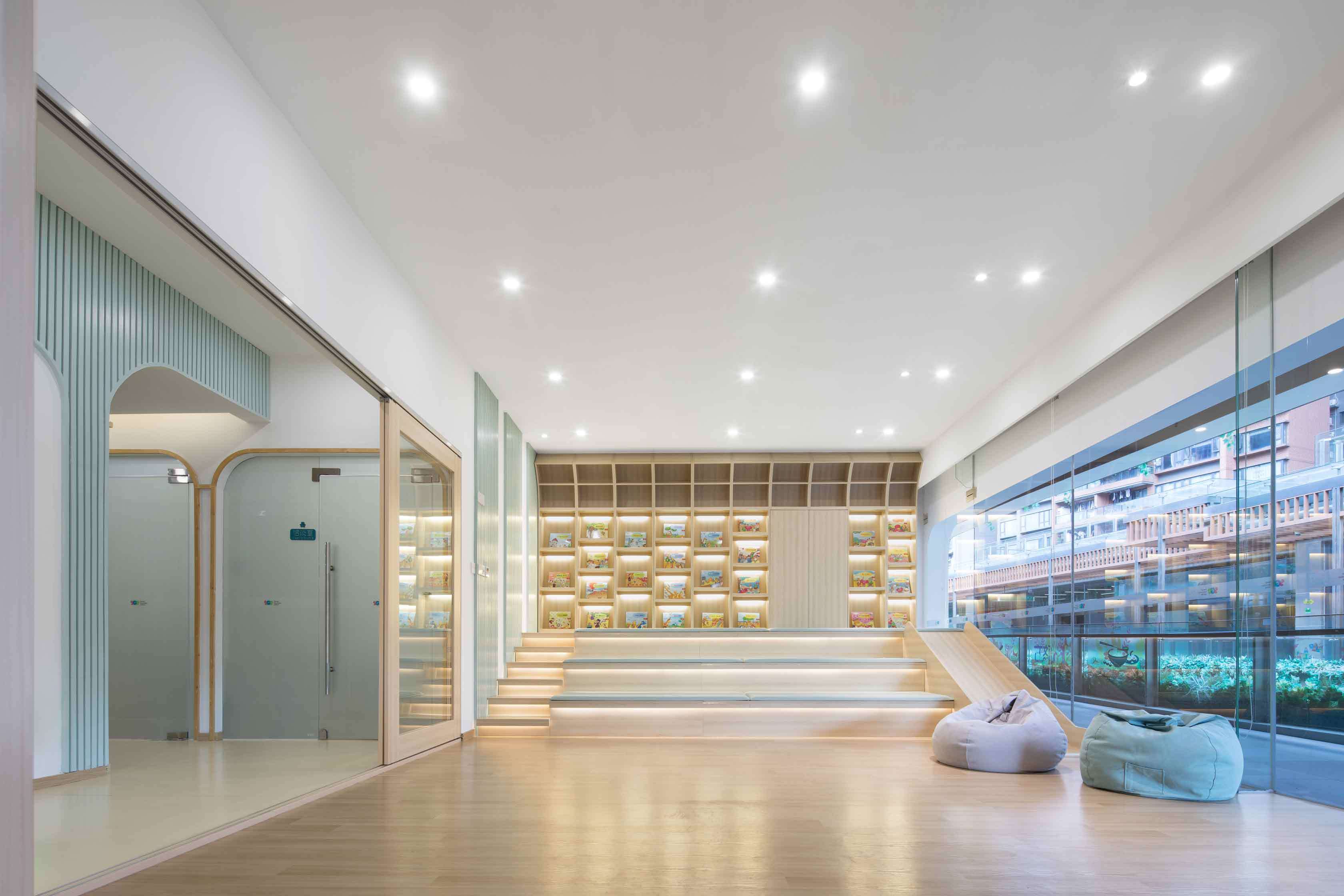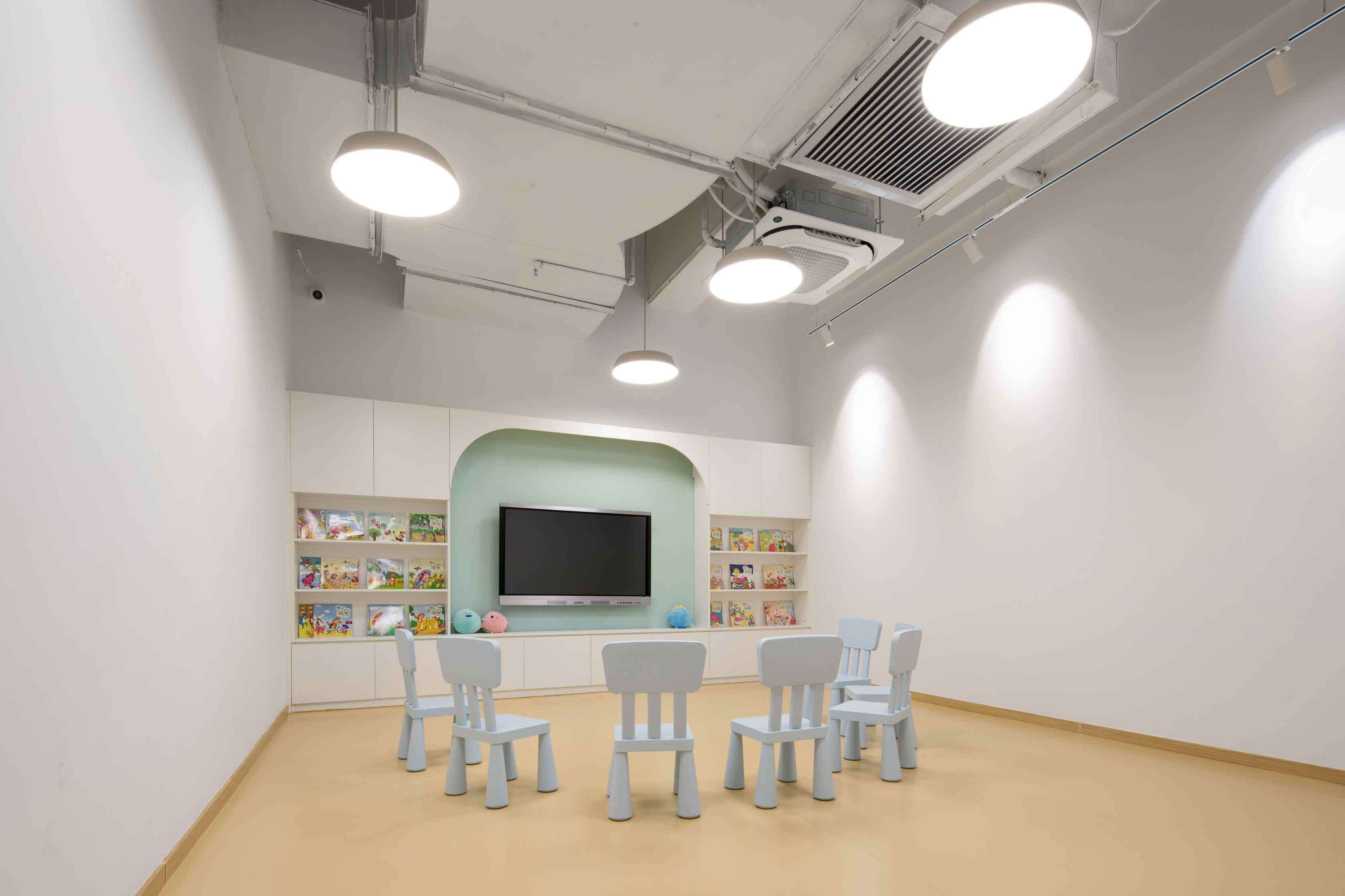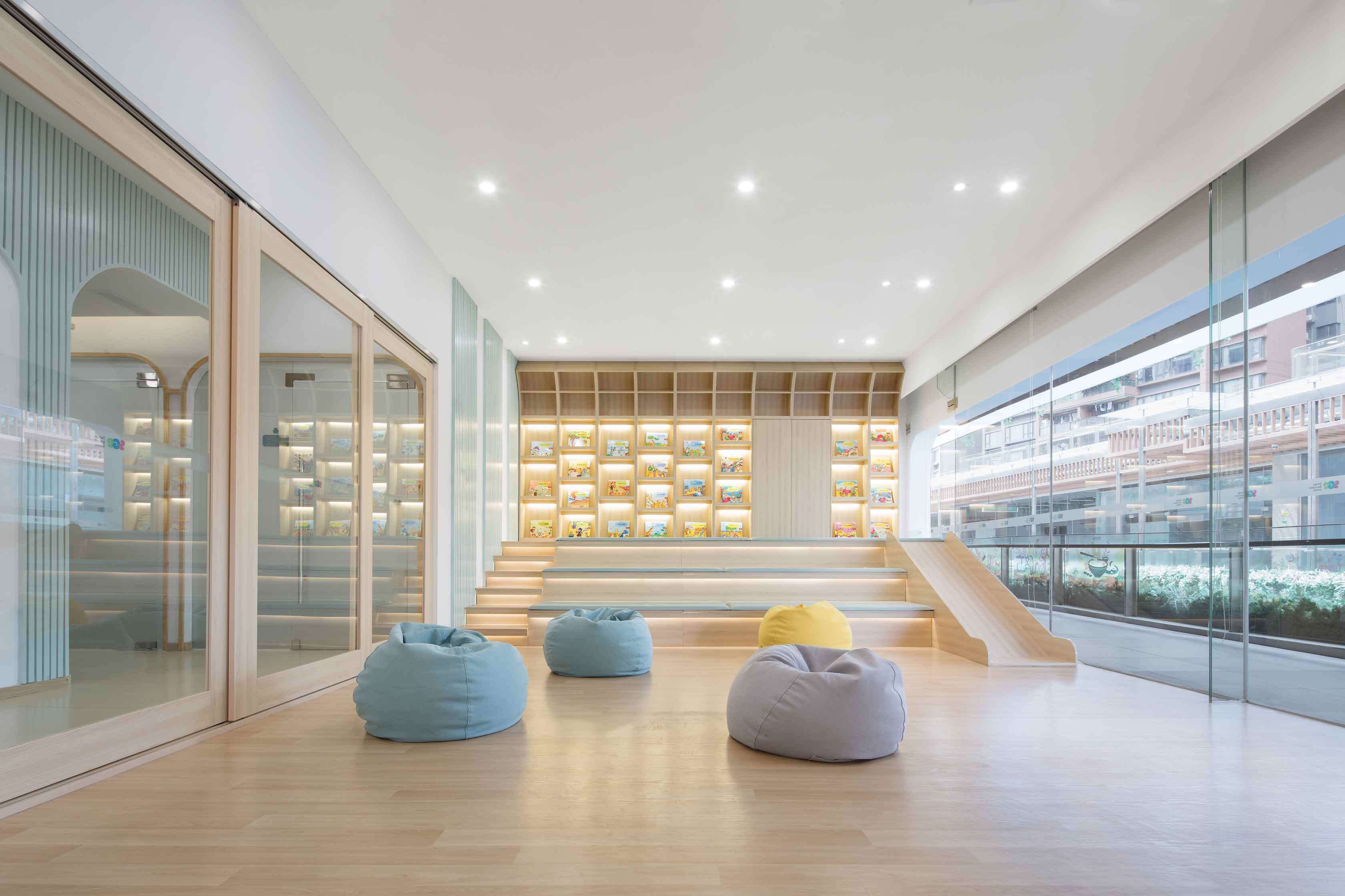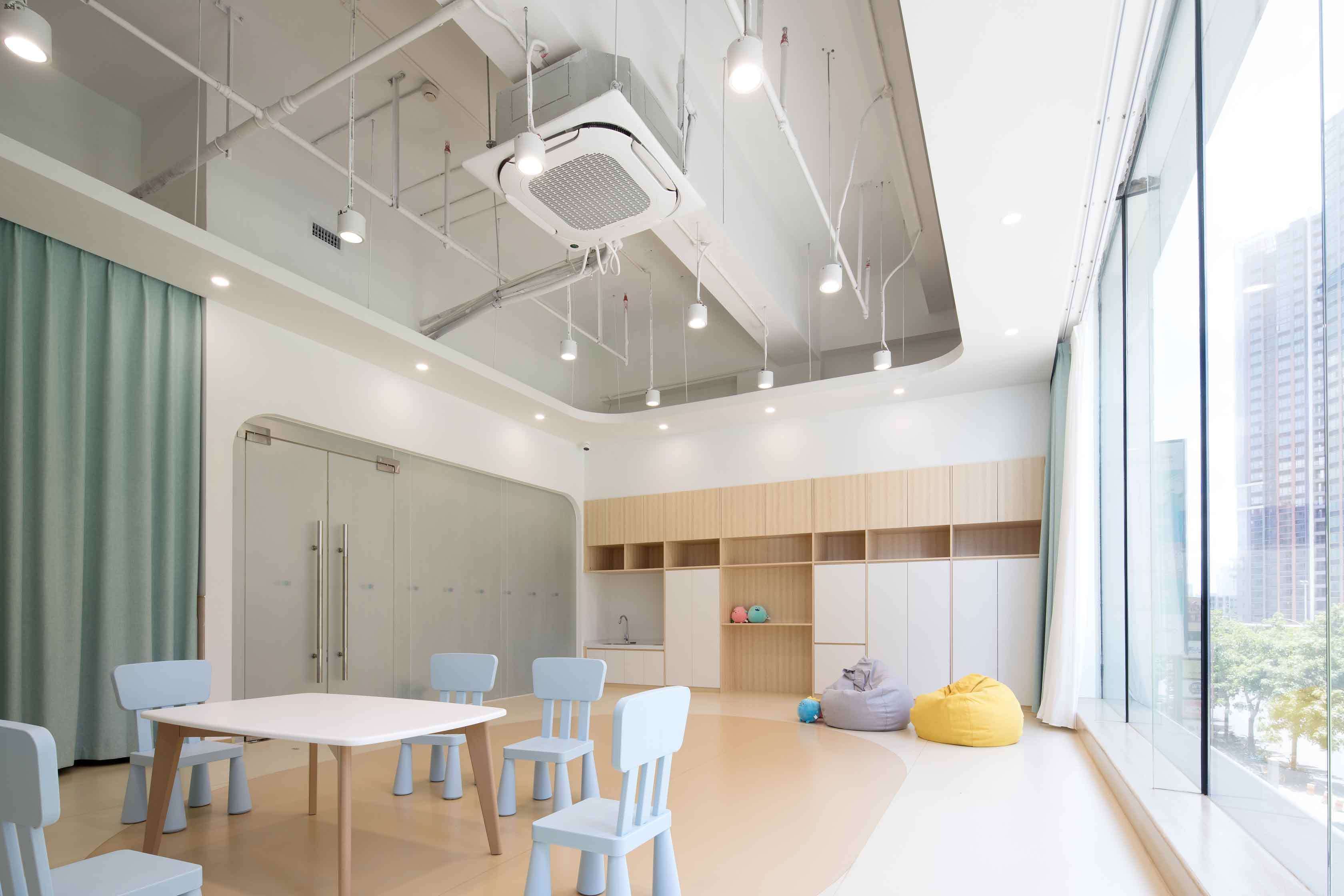 合理利用空間。希望通過對兒童天性、教學(xué)理念和空間特點的剖析,能夠在有限的空間里創(chuàng)造出不緊迫的尺度關(guān)系,破除“小型機構(gòu)孩子的活動和探索尺度不足”的一貫看法,同時打造充滿樂趣和寬松條件的空間感受。
